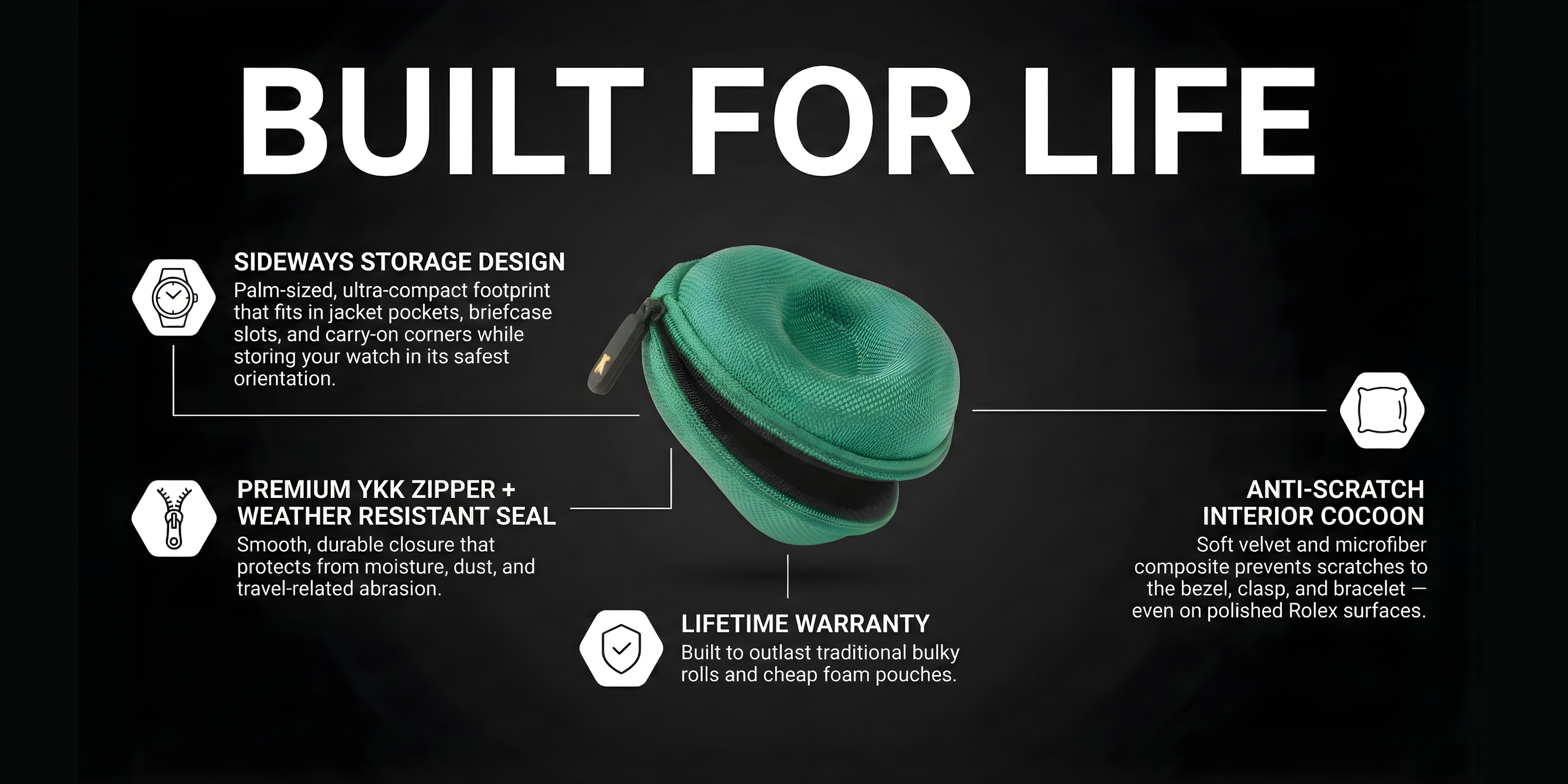 Ein unverzichtbarer Reisebegleiter – neu definiert. Das Vault One Case™ bietet kompromisslosen Schutz für Ihre wertvollste Uhr in einem eleganten, handflächengroßen Gehäuse. Jede Kurve und Kontur ist durchdacht gestaltet: Die stoßfeste EVA-Panzerung absorbiert Aufpralle, während das samtgefütterte Innere einen sicheren Kokon bildet, der Ihre Uhr fest an ihrem Platz hält. Kein Klappern. Kein Risiko. Nur absolute Ruhe – egal, wohin Sie reisen.